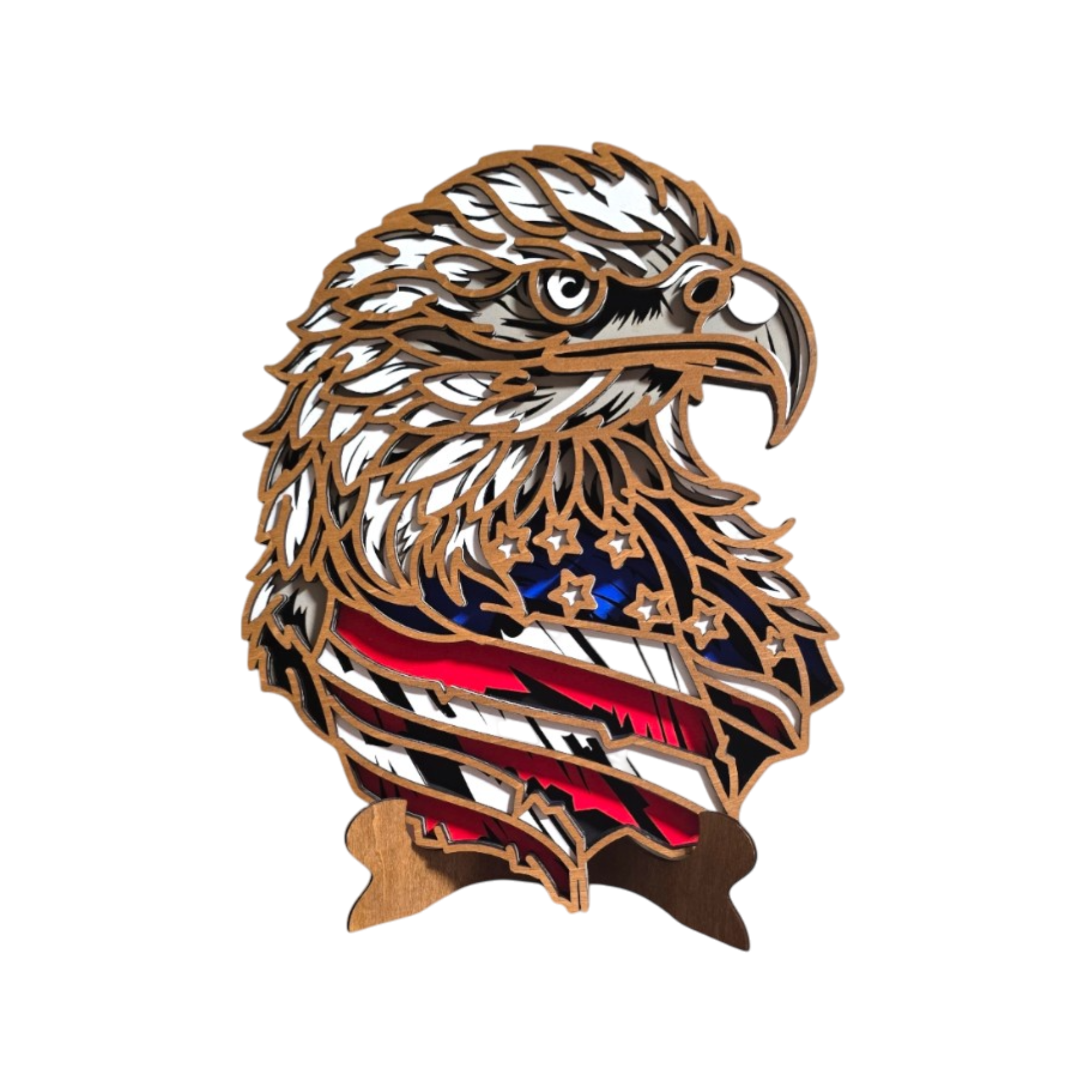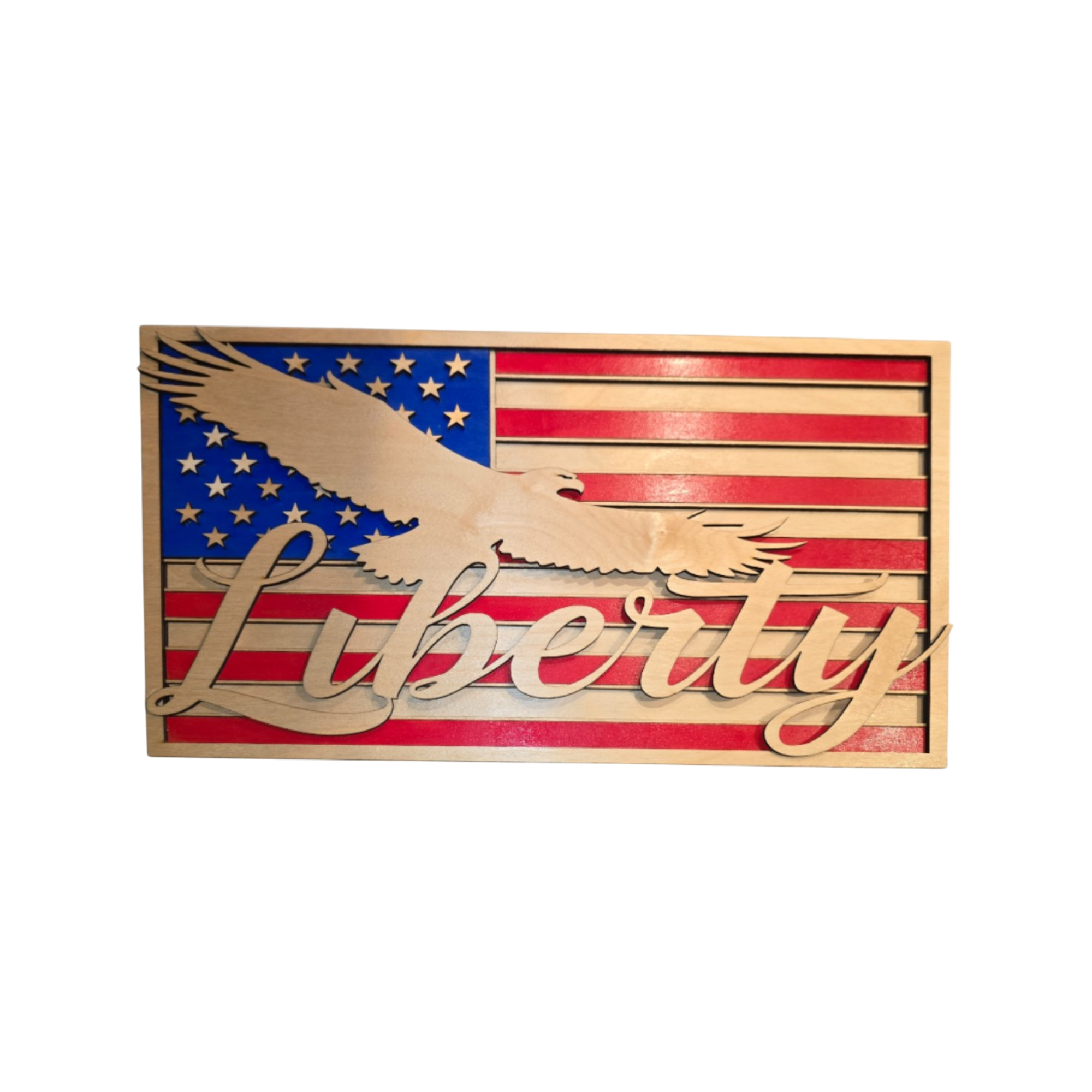 This layered wood American flag design features a soaring eagle in flight with the word Liberty stretching boldly across the stars and stripes. Handcrafted and finished in rich patriotic tones, the piece reflects strength, freedom, and faith through clean lines and balanced movement.