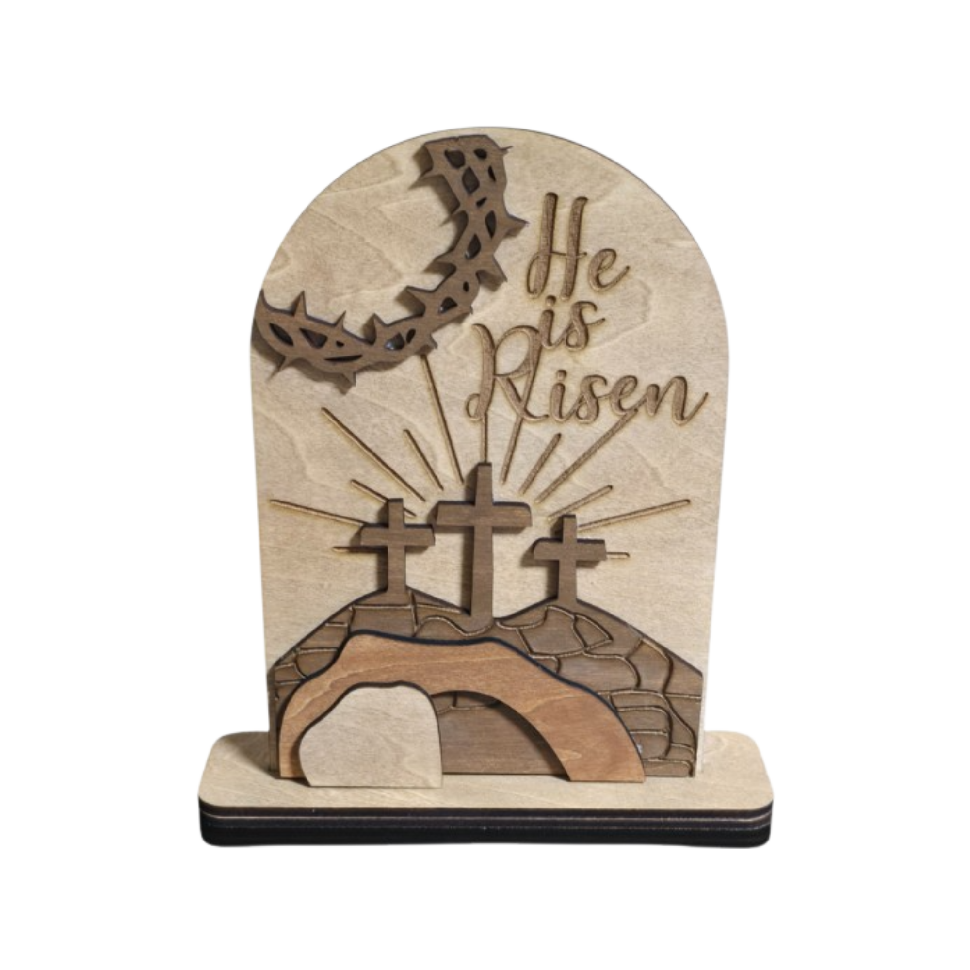 Inspired by the resurrection story, this handcrafted layered wood piece proclaims the hope-filled truth of Easter: He Is Risen. Featuring the three crosses, an empty tomb, and rays of light breaking forth, the design reflects the victory and promise at the heart of the Christian faith.