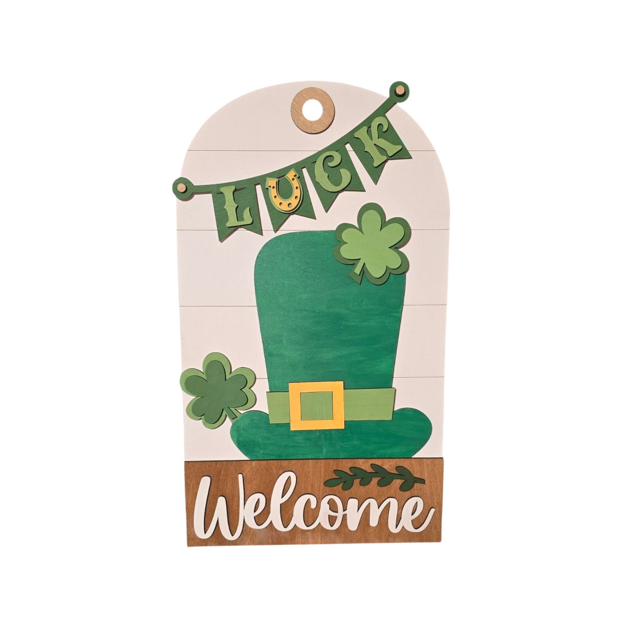 Celebrate the season with this cheerful St. Patrick’s Day insert designed for use with the interchangeable door or entryway sign system. Featuring a classic green top hat, shamrock accents, and a festive Lucky banner, this design brings a lighthearted reminder of blessings and good cheer in a warm farmhouse style.