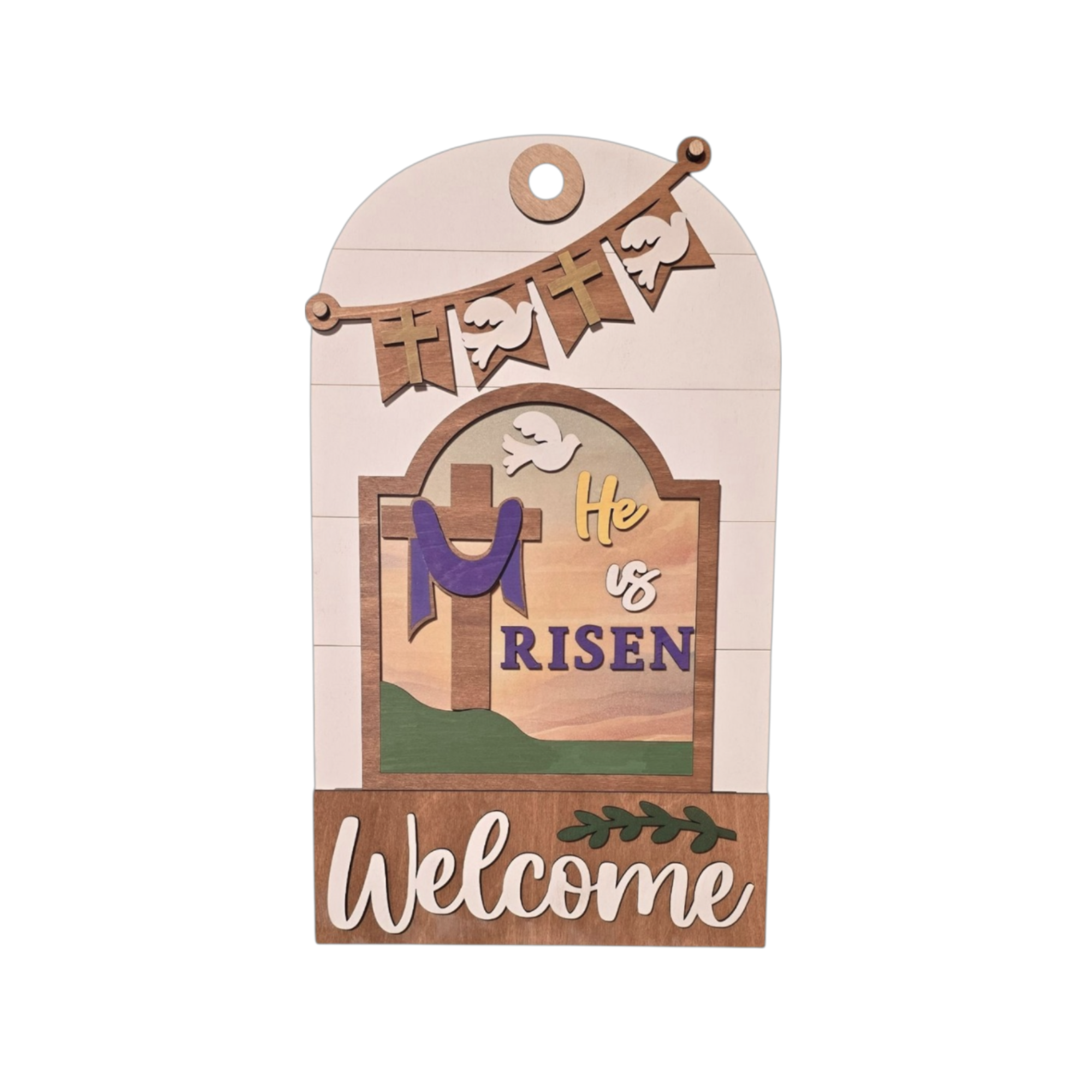 Celebrate the hope and victory of Easter with this faith-centered layered insert designed for use with the interchangeable door or entryway sign system. Featuring a cross draped in purple, a rising dove, and the powerful declaration He Is Risen, this design reflects the joy and promise of the resurrection in a warm farmhouse style.