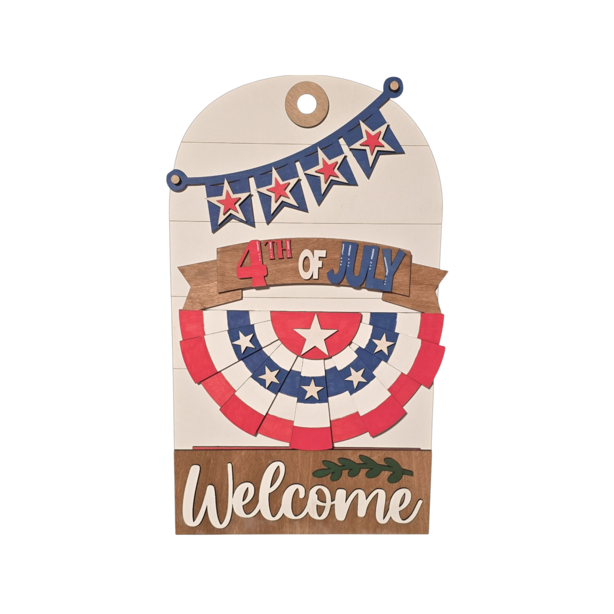 Celebrate patriotic pride with this bold seasonal insert designed for use with the interchangeable door or entryway sign system. Featuring layered red, white, and blue bunting, star accents, and a classic 4th of July banner, this piece brings timeless Americana charm to your home décor.