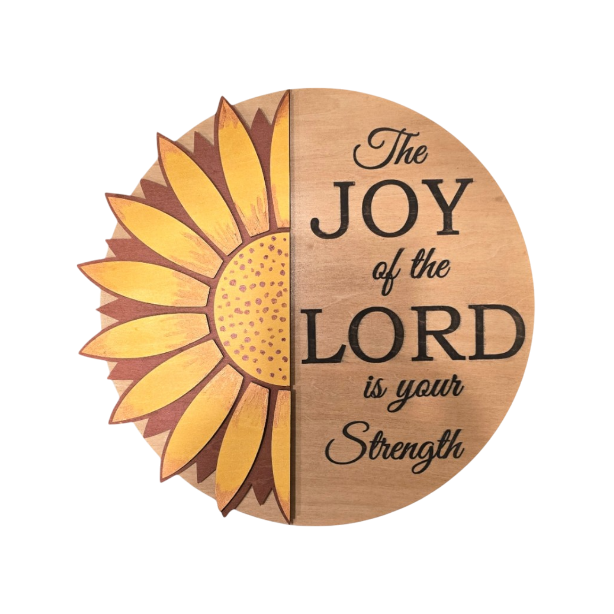 A radiant sunflower design paired with the promise of Nehemiah 8:10: “The joy of the Lord is your strength.” This warm, uplifting piece blends rustic charm with Scripture truth, offering a cheerful reminder of God’s strength and faithfulness.