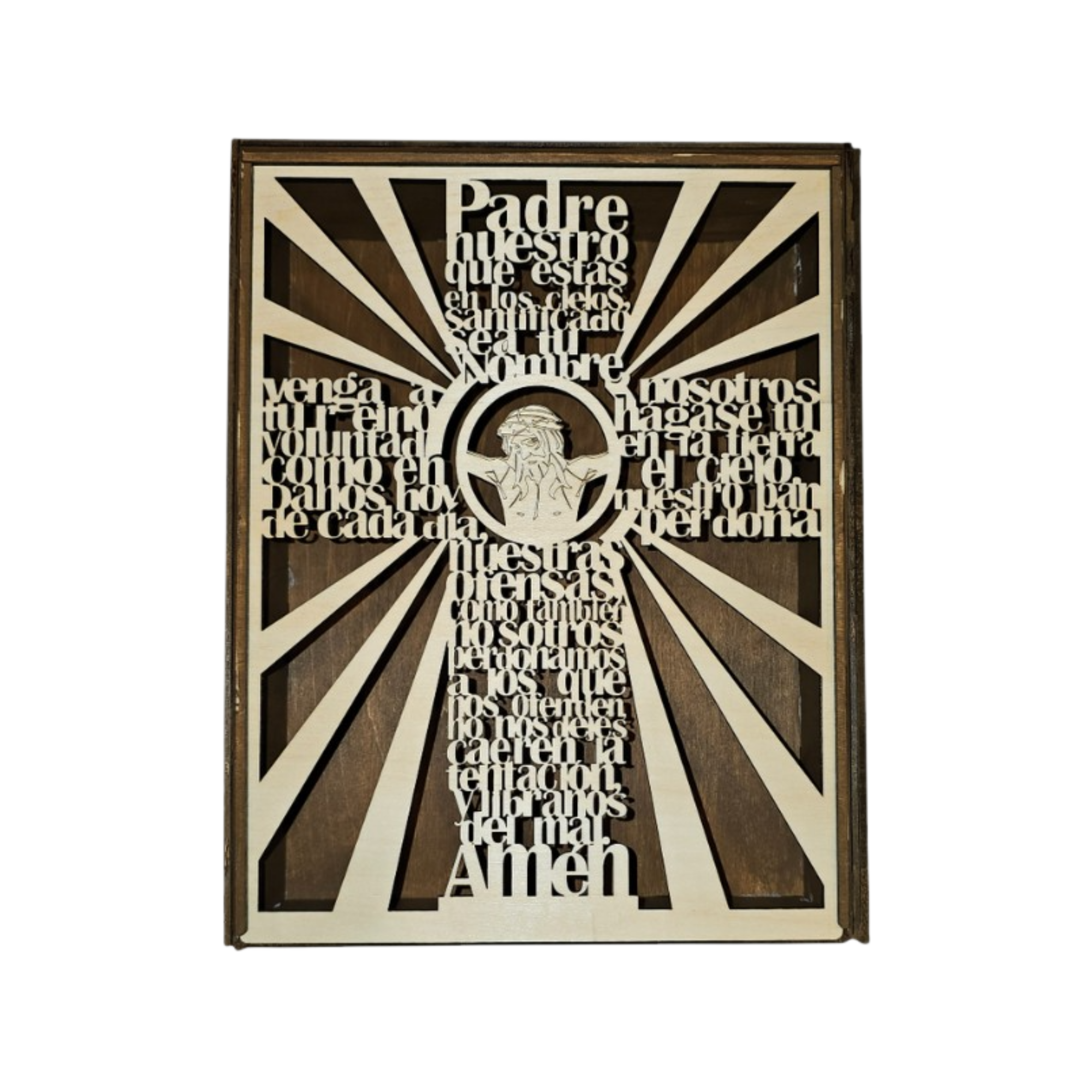 An intricate handcrafted shadow box featuring a cross formed entirely from the full text of the Lord’s Prayer. Framed within a radiant sunburst design, this piece serves as a powerful visual expression of faith, prayer, and tradition.