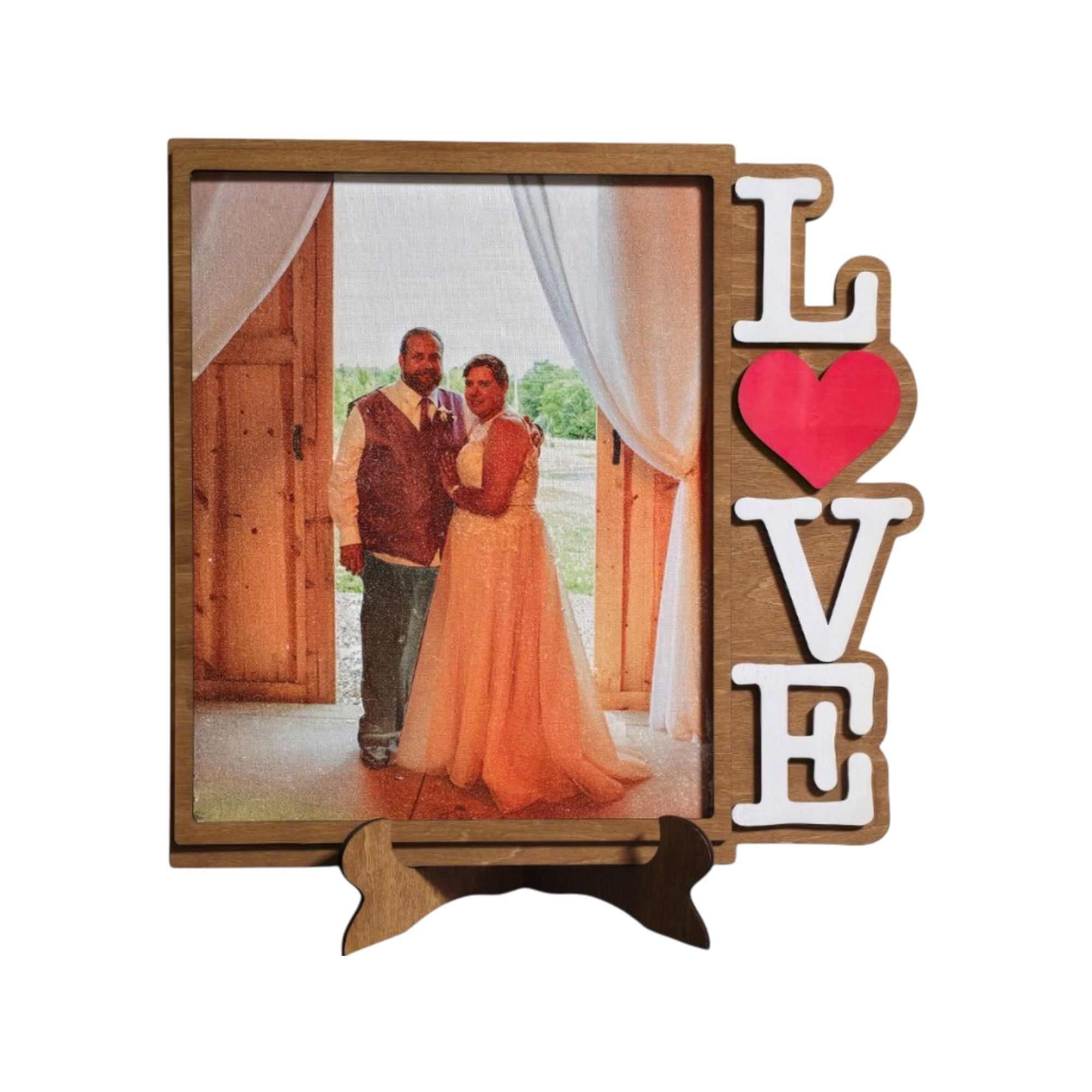 This handcrafted wood display spells out LOVE while holding a treasured photo at its center.