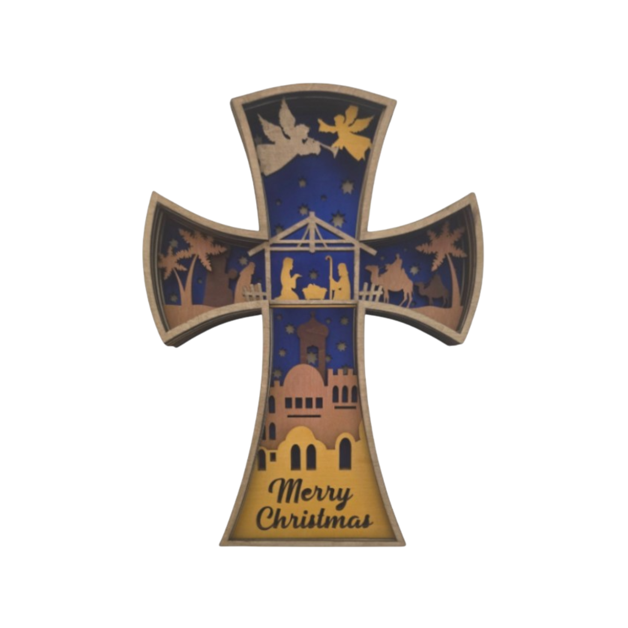 Celebrate the beauty and reverence of the Christmas story with this striking layered wood cross. Featuring a detailed nativity scene beneath a starlit sky, angels in praise, and the words Merry Christmas at the base, this design reflects the quiet wonder and holy significance of Christ’s birth.