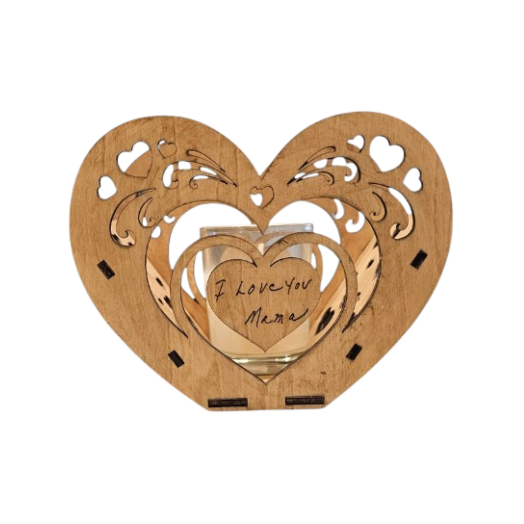 • Handcrafted layered wood heart lantern