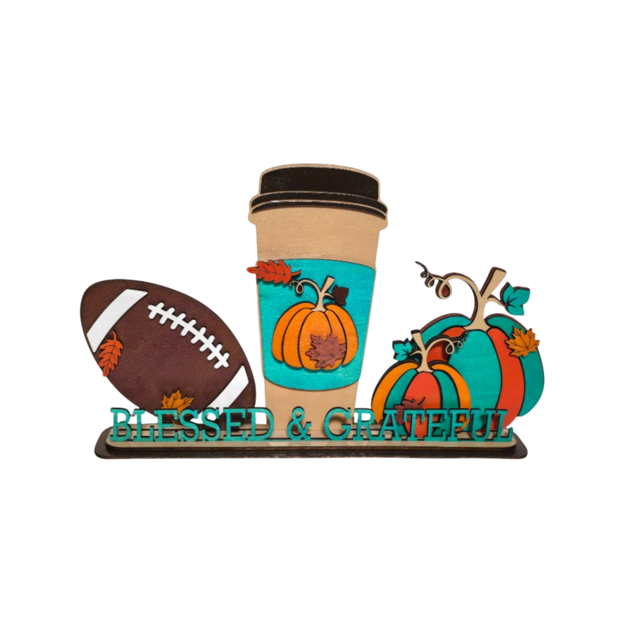 Celebrate the cozy joy of fall with Harvest of Gratitude, a handcrafted layered wood display designed to reflect the warmth of the season. Featuring pumpkins, a football, and a steaming cup of coffee, this piece captures the simple blessings of autumn—gratitude, comfort, and togetherness.