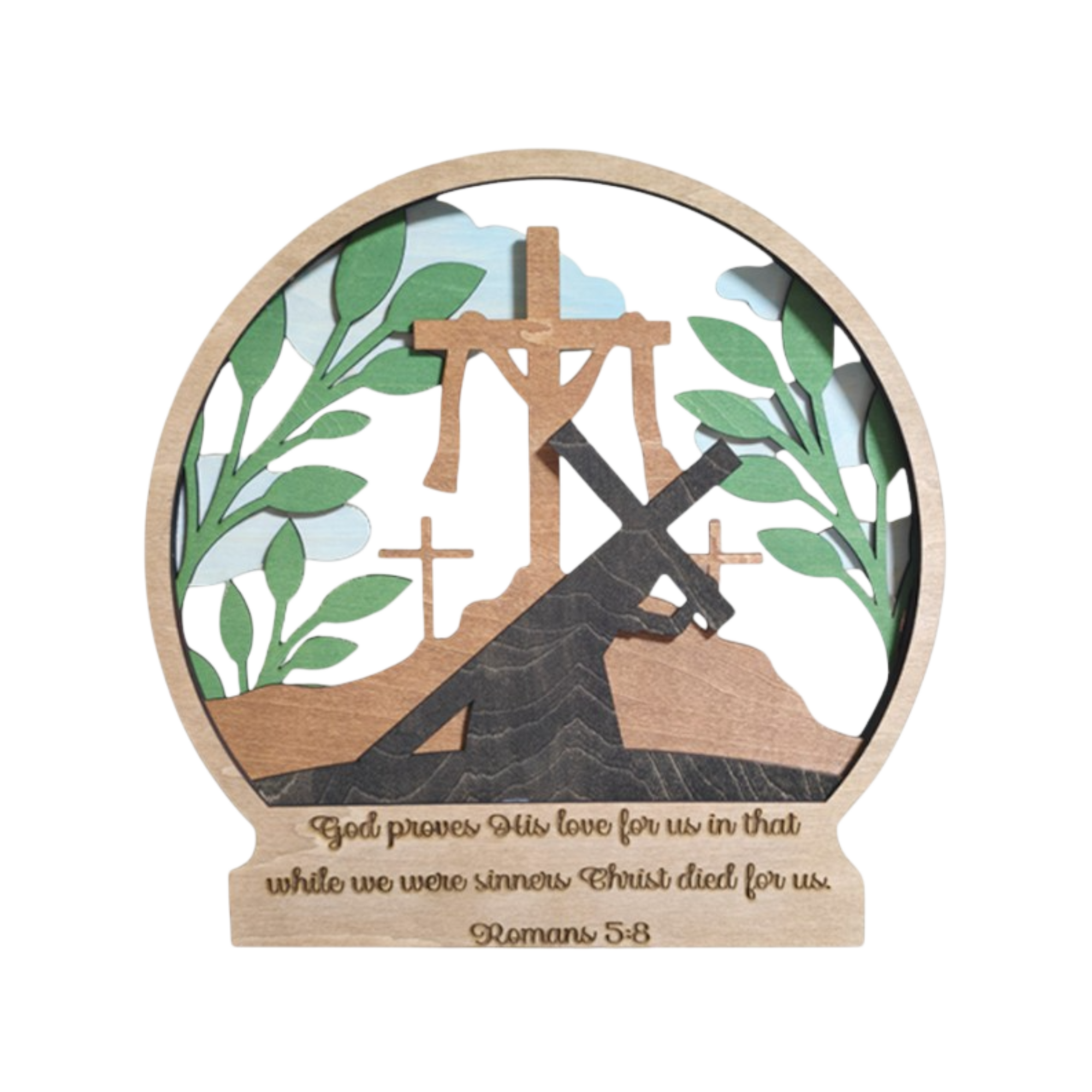 A circular wood display that brings Scripture to life. This handcrafted piece features layered crosses and flowing foliage surrounding the words of Romans 5:8, serving as a powerful reminder of grace freely given and hope firmly rooted in Christ.
