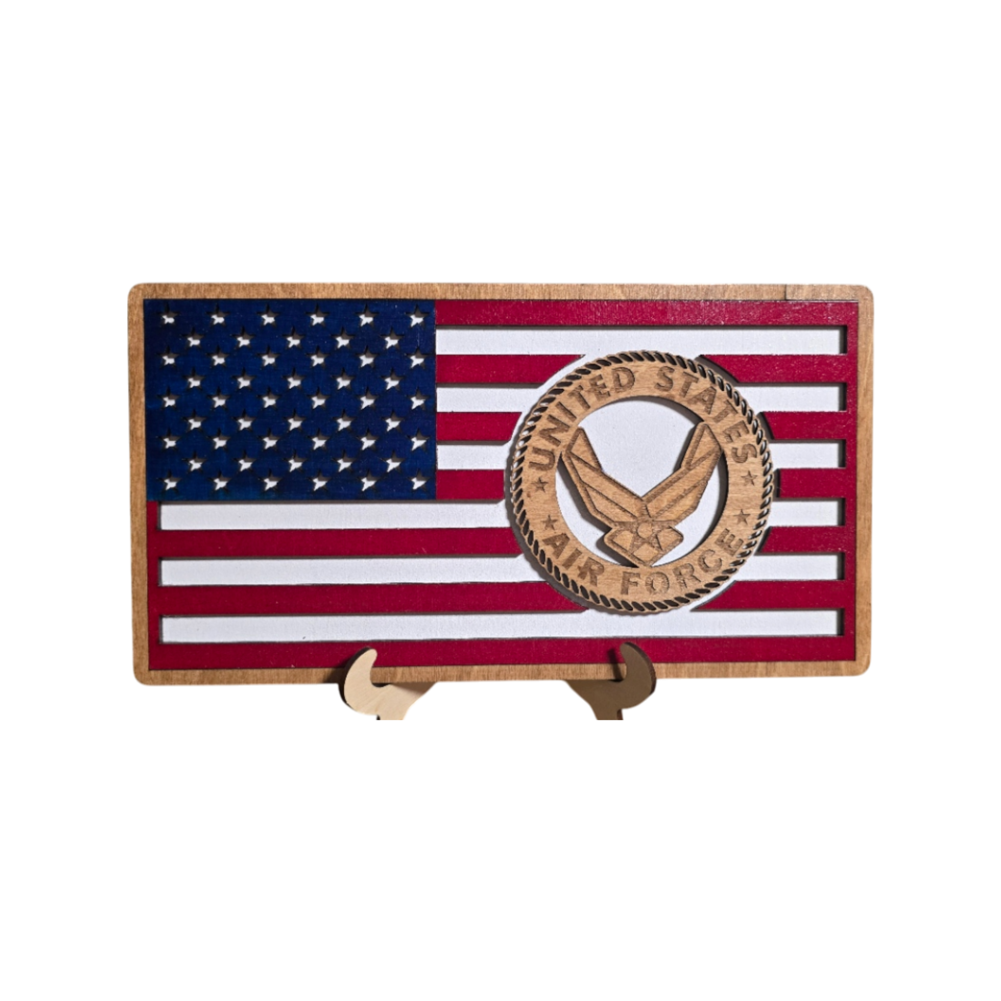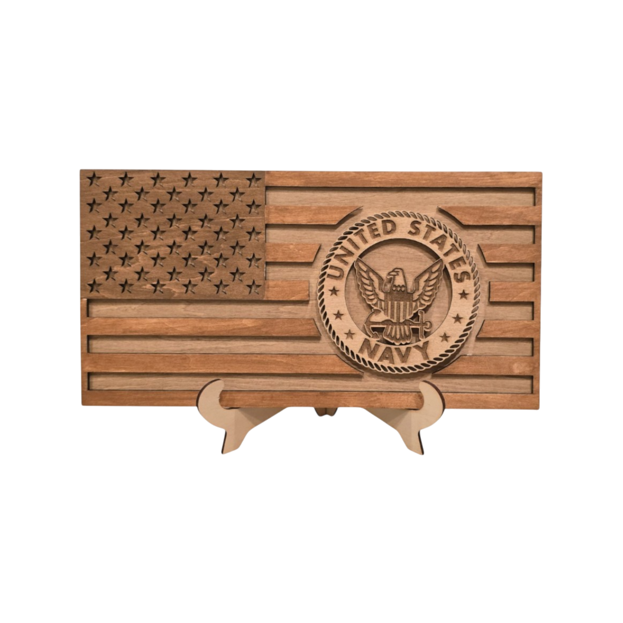 Honor service, sacrifice, and unwavering dedication with this elegant stained wood American flag display. This variation features a natural stained finish paired with your choice of engraved military or service emblem, offering a timeless and understated tribute to those who have served and those who are remembered.