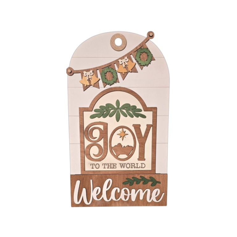 Celebrate the season of Christmas with this layered, faith-filled insert designed for use with the interchangeable door or entryway sign system. Featuring a classic Joy to the World design with a nativity-inspired star, greenery accents, and festive banner details, this piece brings the message of Christ’s birth into your home with warmth and reverence.
