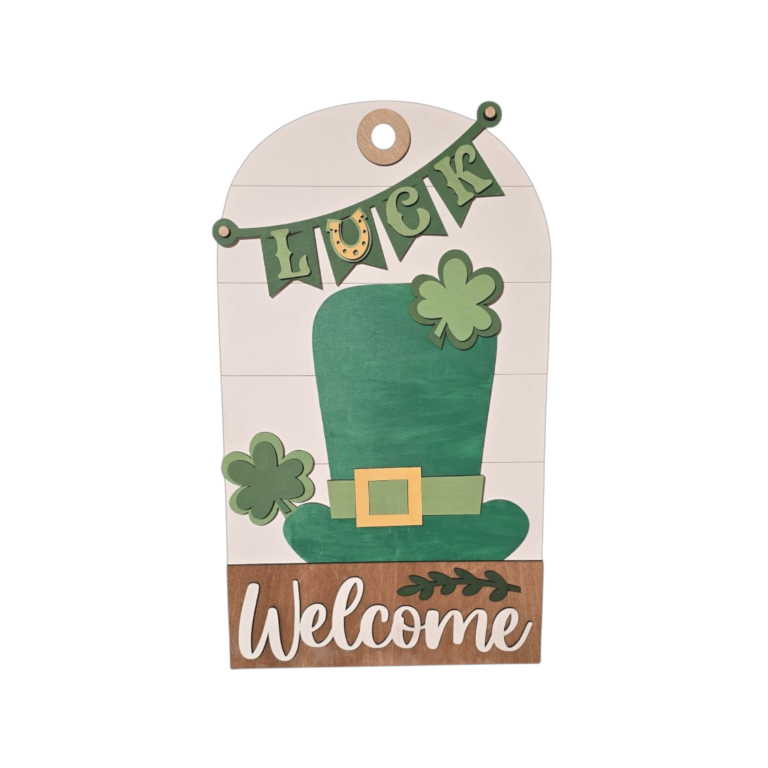 Celebrate the season with this cheerful St. Patrick’s Day insert designed for use with the interchangeable door or entryway sign system. Featuring a classic green top hat, shamrock accents, and a festive Lucky banner, this design brings a lighthearted reminder of blessings and good cheer in a warm farmhouse style.