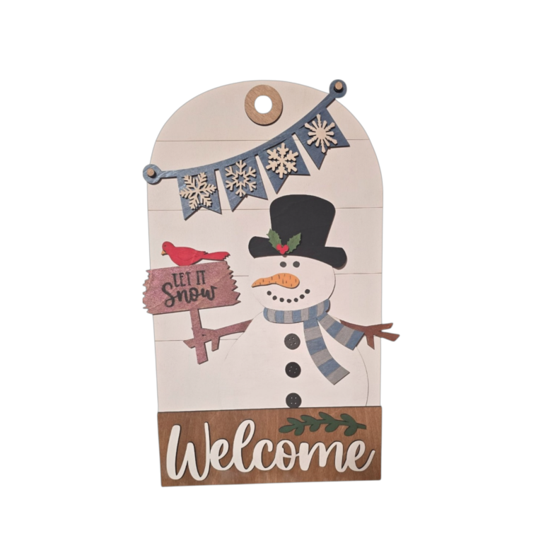 Bring cozy winter charm to your home with this layered snowman insert designed for use with the interchangeable door or entryway sign system. Featuring a cheerful snowman, a cardinal perched on a Let It Snow sign, and a delicate snowflake banner, this design adds warmth and seasonal joy to your décor.