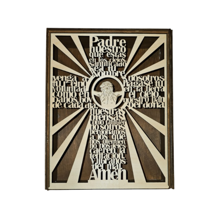 An intricate handcrafted shadow box featuring a cross formed entirely from the full text of the Lord’s Prayer. Framed within a radiant sunburst design, this piece serves as a powerful visual expression of faith, prayer, and tradition.